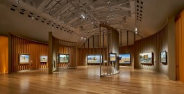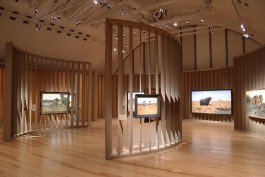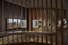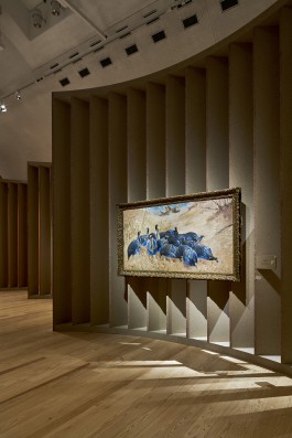 Die Bildträger in der Ausstellung bestehen aus offenen, organisch geformten Lamellenwänden aus Holz. Diese Lamellenwände lassen den Blick auf die Gemälde und durch die Wände hindurch, auf den dahinterliegenden Ausstellungsraum zu. Die Architektur referiert Kuhnerts Arbeits- und Sichtweise auf seine Modelle: Die freien Tiere in den afrikanischen Savannen und Urwäldern zu beobachten und zu malen. Die Lamellenwände formen offene Räume, die eine gleichzeitige Wahrnehmung der verschiedenen Motive im Raum ermöglichen. Es ist nicht die Atmosphäre einer klassischen Gemäldeausstellung. Es ist die Welt, in der Kuhnert seine Modelle beobachtet.