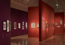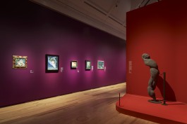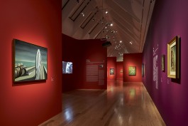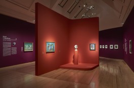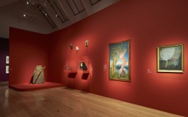 Dunkelviolett angelegte Ausstellungsräume gliedern rote Raum-Formen in Werkbereiche oder Kabinette. Diese Raum-Formen sind in Ihrer Gestalt Solitäre, mit organisch geformten Wandflächen. Sie erscheinen in der Ausstellung allerdings nicht wie Objekte. Es sind die von Ihnen geformten räumlichen Situationen, die einen besonderen Hintergrund für die Werke der Künstlerinnen des Surrealismus erzeugen.